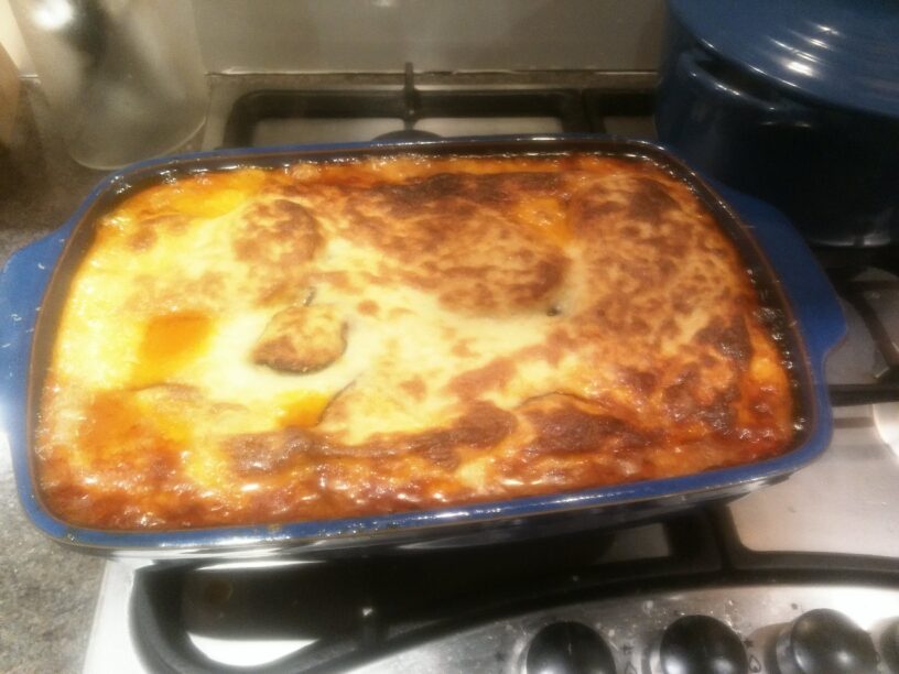 Build the moussaka: one third of the meat sauce; one third of the potatoes; one third of the aubergines; repeat twice. These don’t need to be complete layers, just roughly arranged. Pour over the white sauce to cover everything and sprinkle with Parmesan. Bake for 35–45 minutes at 200°C. Serve with green salad.