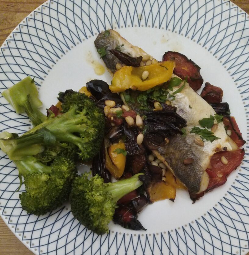 Put sea bass on top of the vegetables, skin up to avoid the flesh drying out. Bake for a further 15 minutes.